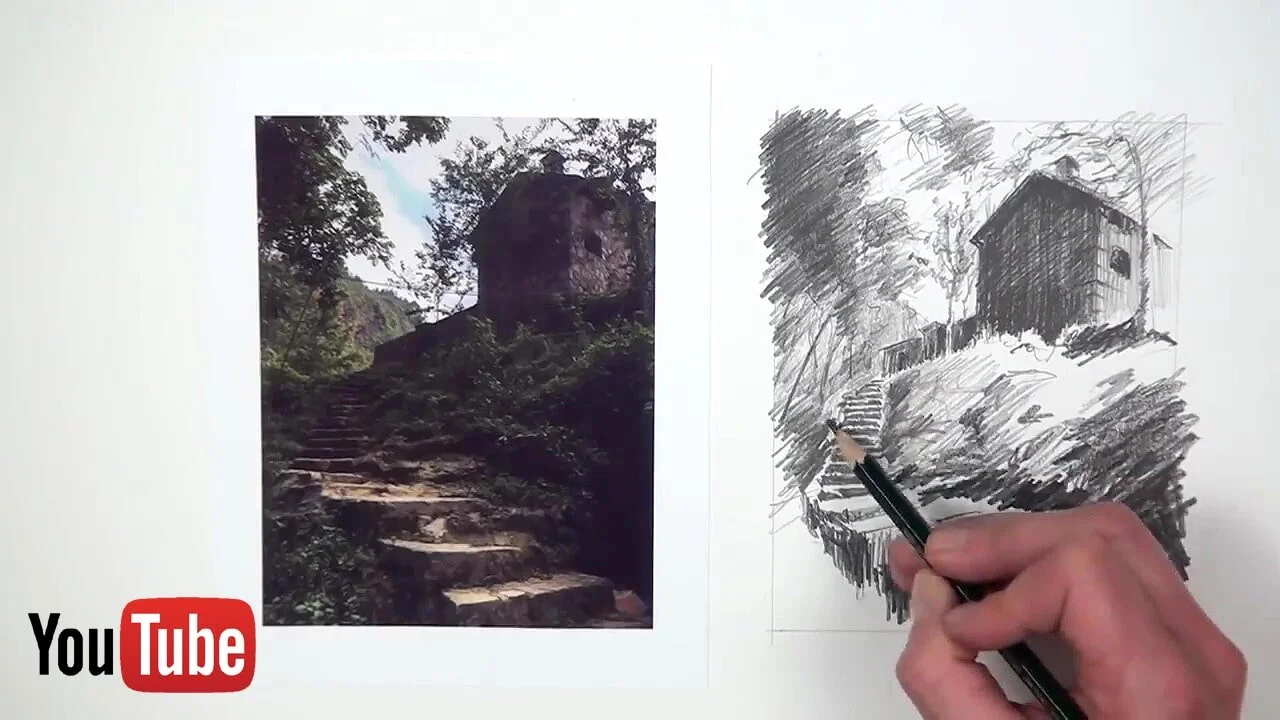 Luckily ArtTutor has created this lovely little video that I've referenced in my post How to Simplify your Drawings. It's an 18-minute version of the artist drawing a single sketch of a house and some greenery, with explanations, tips and tricks.